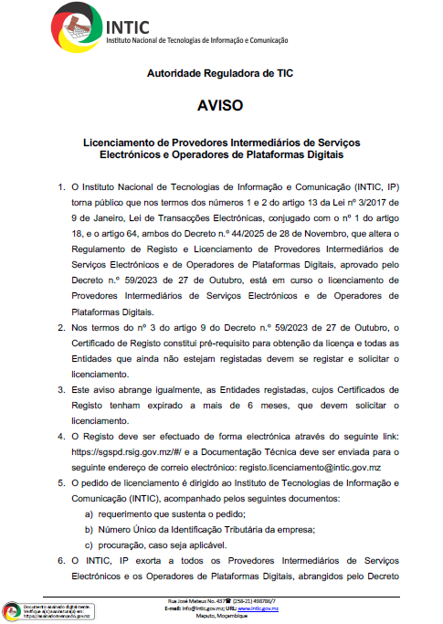 A Divisão de Licenciamento e Certificação é a área responsável por processos de licenciamento, registo, certificação e fiscalização de oporadores do sector de TIC, que abrange provedores intermerdiários de serviços de Internet, Agentes de Registo de nomes sob o domínio “.mz”, entidades certificadoras no âmbito do Sistema Certificação Digital de Moçambique (SCDM). Neste momento, a […]